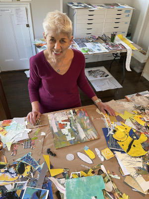 With my layered mixed-media paintings, I incorporate charcoal, pencil, and crayon. I then add layers of paint and often collage, sometimes concealing, sometimes revealing what’s underneath. The possibilities and properties of paint are allowing me to expand my visual language and dive deeper into expressing a range of feelings and emotions. With my first collages made from cut paper and imagery not of my own making — and wanting to put more of myself into my work — I turned to recent drawings, prints, and marks. Adding painting into the mix has me experience a connection with artists throughout time and history, back to the lineage of the first cave painters. I find using my hands, brushes, and other tools to apply paint to be a visceral experience, different from cutting and pasting collage elements. When I incorporate both paint and collage in a work, it is like speaking more than one language, that is, holding more than one, sometimes seemingly contradictory, idea at the same time. This turns out to be yet another juxtaposition, and, in my experience, a good skill to have in life as well as art.